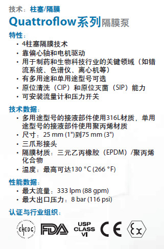 uattroflow的產品需要主要供應于密封性好、純度高、無菌的制藥業和生物技術產業。Quattroflow的容積式泵產品采用無機械密封的四活塞隔膜技術,該泵由一個偏心軸桿及發動機驅動。