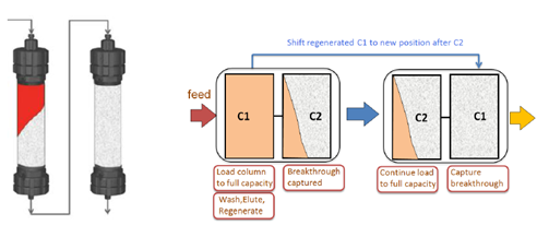 ??? ?? 傳統層析工藝,由于流穿效應,有30-50%的填料是無法被完全利用的,從而使得載量和處理量大為受限。Capture SMB用于優化捕獲環節,作為最簡單和最優化的2柱位設計,可使純化效率顯著提高,并且使填料用量大為縮減。