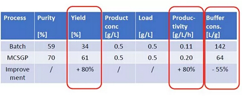? ? 有案例證明,MCSGP可將產品純度從傳統工藝的59%提升至70%,將收率從傳統工藝的34%提升至61%,從而使產量(g /L /h)整體提升80%,并同時使Buffer的消耗量降低55%MCSGP工藝,無疑可顯著地節約成本投入,并可產生更多的生產效益。