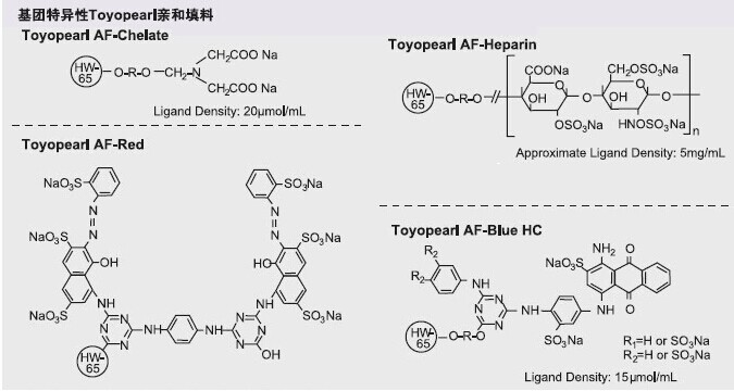 ?Toyopearl AF-Heparin HC-650M填料。肝素是線型的高硫酸化葡萄糖胺聚糖,具有抗凝血性能。由于其多陰離子性質,肝素能和廣泛的生物分子相互作用,包括血漿成分、脂蛋白脂肪酶、膠原酶和DNA聚合酶等。在親和層析中,固定化肝素被廣泛用作吸附劑來純化生物物質。TOYOPEARL AF-Heparin HC-650M填料是一種高載量高親和力的吸附劑,具有優良的化學穩定性。