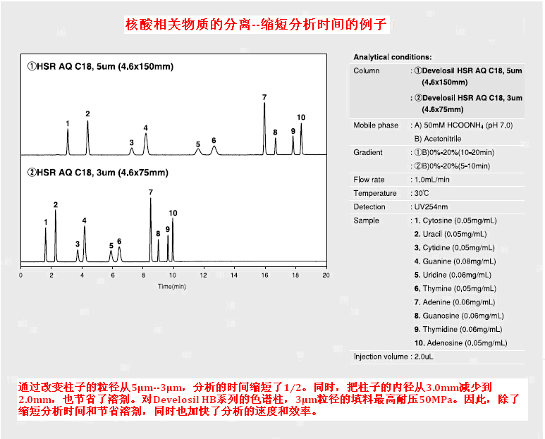 縮短分析時間可以幫助分析者提高工作效率。Develosil系列色譜柱會嚴格的控制填料的粒徑,所以通過縮小柱填料的粒徑,可以精準的縮短分析時間。