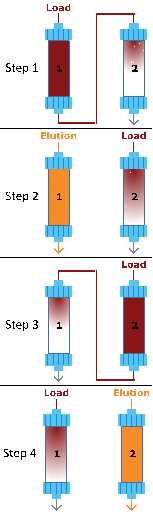 步驟?4:柱2進行洗脫、清洗和再平衡,同時柱1進行連續(xù)上樣。該連續(xù)處理方法循環(huán)進行。