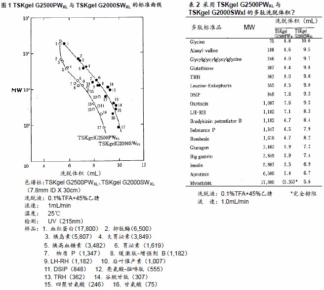 ??? 表2所示為各多肽標準液的洗脫體積,圖1所示為標準曲線。洗脫液采用含有45%乙腈的0.1%TFA溶液。所有TSKgel G2000SWXL的樣品洗脫速度均慢于TSKgel G2500PWXL。同時,在TSKgel G2000SWXL中,肌球蛋白(MW17800)進入填充劑的小孔內部,但在TSKgel G2500PWXL中,肌球蛋白被小孔排阻,從外水體積中被洗脫。根據其結果,可認為TSKgel G2500PWXL在上述洗脫液條件下的多肽分子量排阻界限推測為8000,相比之下,硅膠型填充劑TSKgel G2000SWXL,可適用于從低分子量到高分子量區域更廣的范圍。