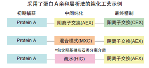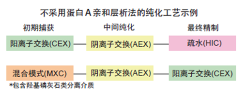 ??? 不采用蛋白A親和層析法的純化工藝可降低工藝成本。可通過結(jié)合使用陽離子交換層析法 ( CEX ) 、陰離子交換 層析法 ( AEX )、疏水相互作用層析法 ( HIC ) 以及混合模式層析法 ( MXC ) 實(shí)現(xiàn)對(duì)單抗的高純度純化制備。