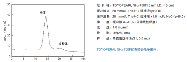 ????陰離子交換填料在抗體的純化工藝中一般通過流穿模式來去除樣品中的宿主細(xì)胞蛋白、核酸、內(nèi)毒素、多聚體等雜質(zhì)。? TOYOPEARL GigaCap Q-650MTOYOPEARL Q-600C ARTOYOPEARL NH2 -750F 等,均是高載量型的優(yōu)異層析填料。