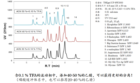 含0.1 % TFA的流動(dòng)相分析疏水性高的多肽時(shí),如果洗脫較遲,可以推薦使用醋酸溶液等。