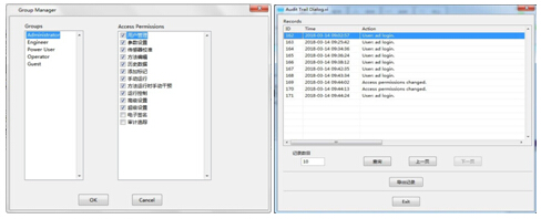 系統采用五級用戶管理權限,可對用戶權限進行自定義分配,并可在運行中更換用戶(便于交接班)。完善的審計追蹤及電子簽名功能,符合cGMP法規要求。